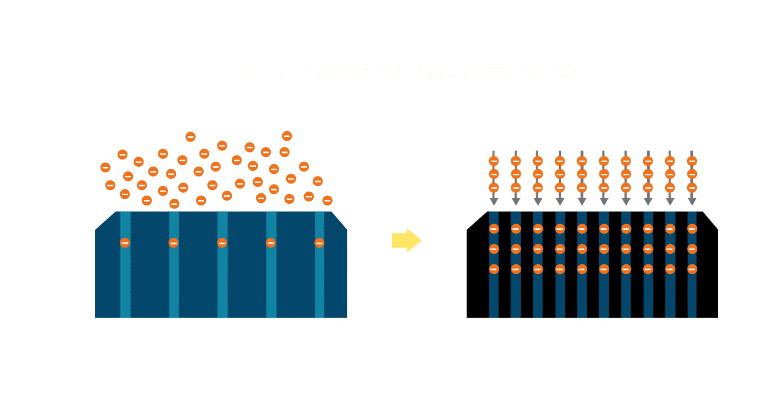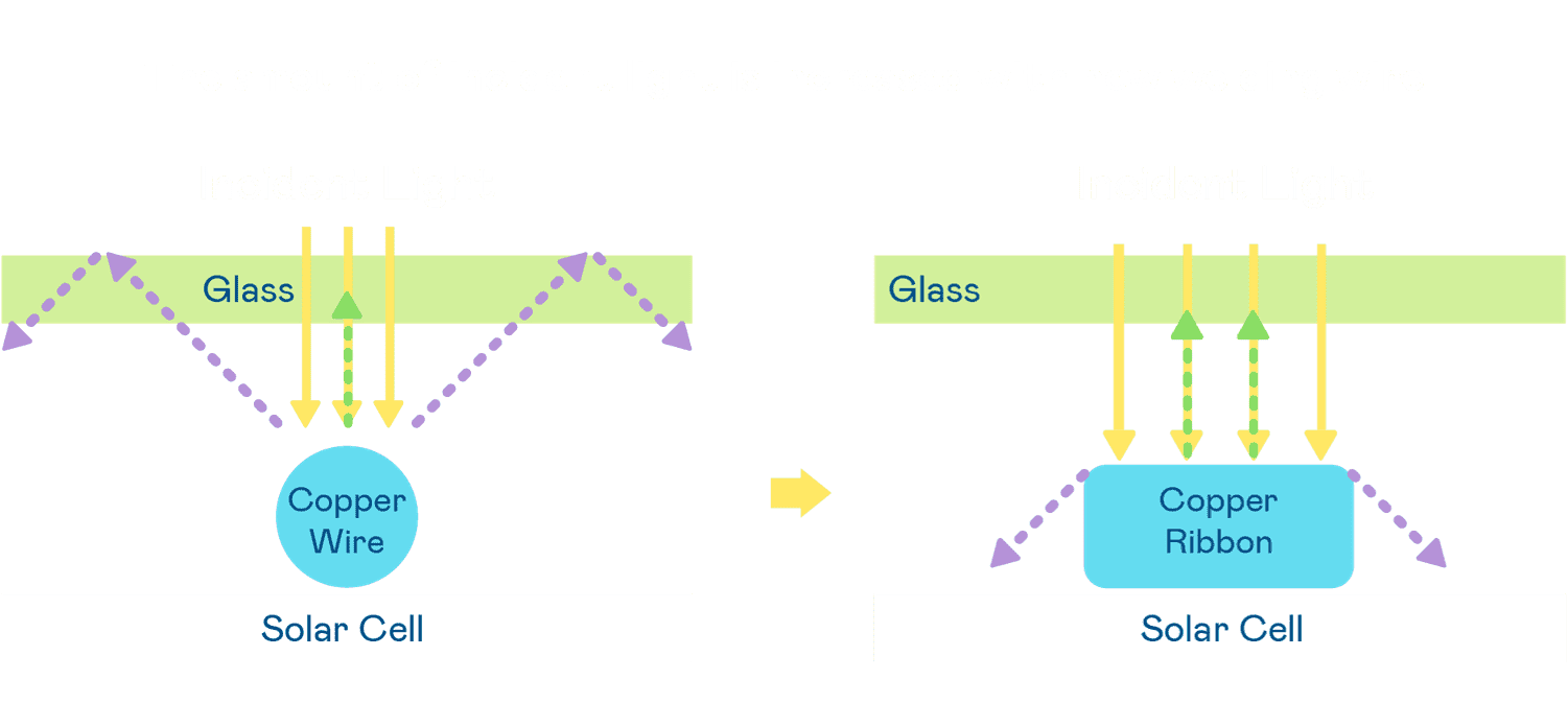 • 电池使用多条铜导线 (Copper wire) 于电池片上形成较短的电流路径,,,提高电流收集效率,,采用圆形设计的铜导线较传统扁平式的铜焊带 (Ribbon),,,,可增加入射至电池的光线量。。