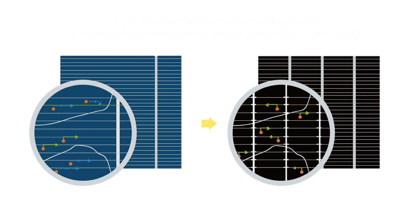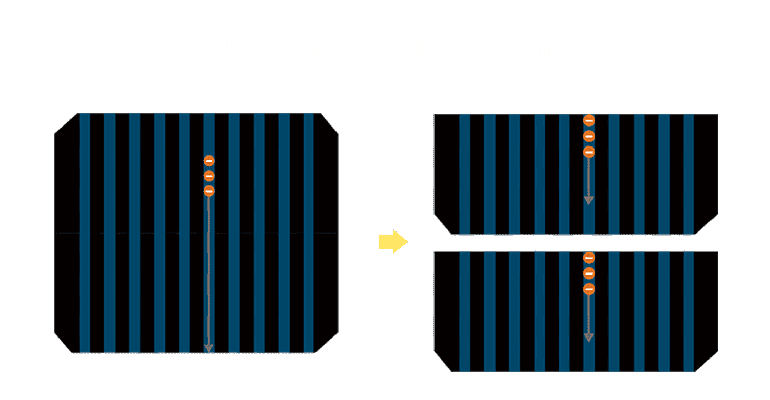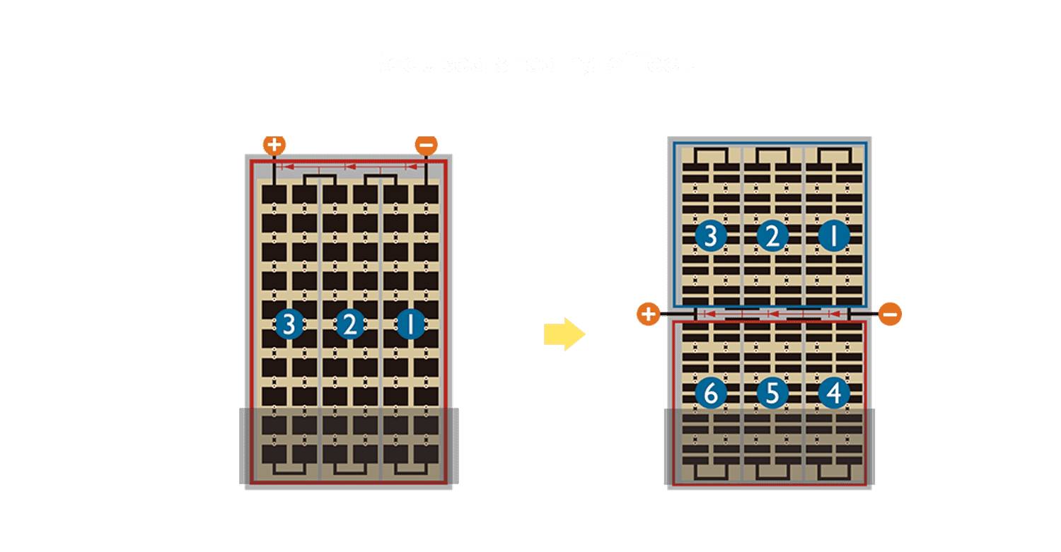 • 结合半切电池,,降低遮阴影响、、、、提升模组抗隐裂能力、、、并减少电阻损耗,,进一步提升模组发电效能。。。。
